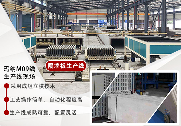 玛纳公司轻质隔墙板生产线设备价格从数十万到数百万不等,其中M09型墙板生产线整体技术采用公司自主创新研制开发的新型成组立模技术装备(系原始技术创新开发,获得MN级技术鉴定),采用立模法机组流水工艺生产,该线使用玛纳多项技术做支撑,拥有完全的自主知识产权,主要满足用户大规划、高品质、高度机械自动化的产品需要,是现在先进的生产工艺装备之一。